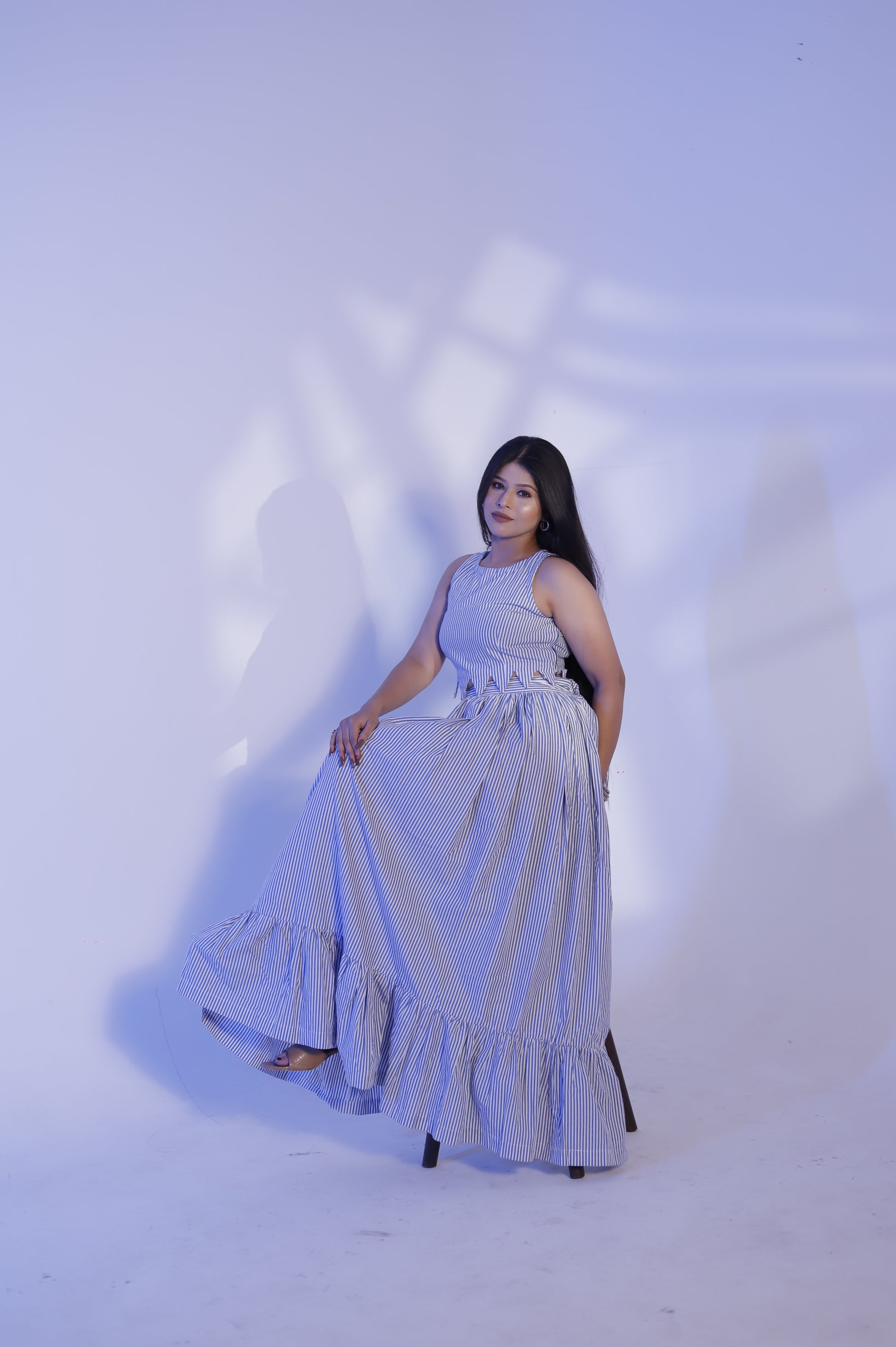 Step into effortless elegance with our blue and white striped sleeveless maxi dress, designed for women who love comfort without compromising style. Crafted from premium breathable cotton blend, this full-length flared dress features a round neckline, side cut-out details, and a ruffled hem for a feminine touch. Perfect for both casual day outings and resort vacations, its flowy silhouette ensures ease of movement while keeping you cool and stylish.