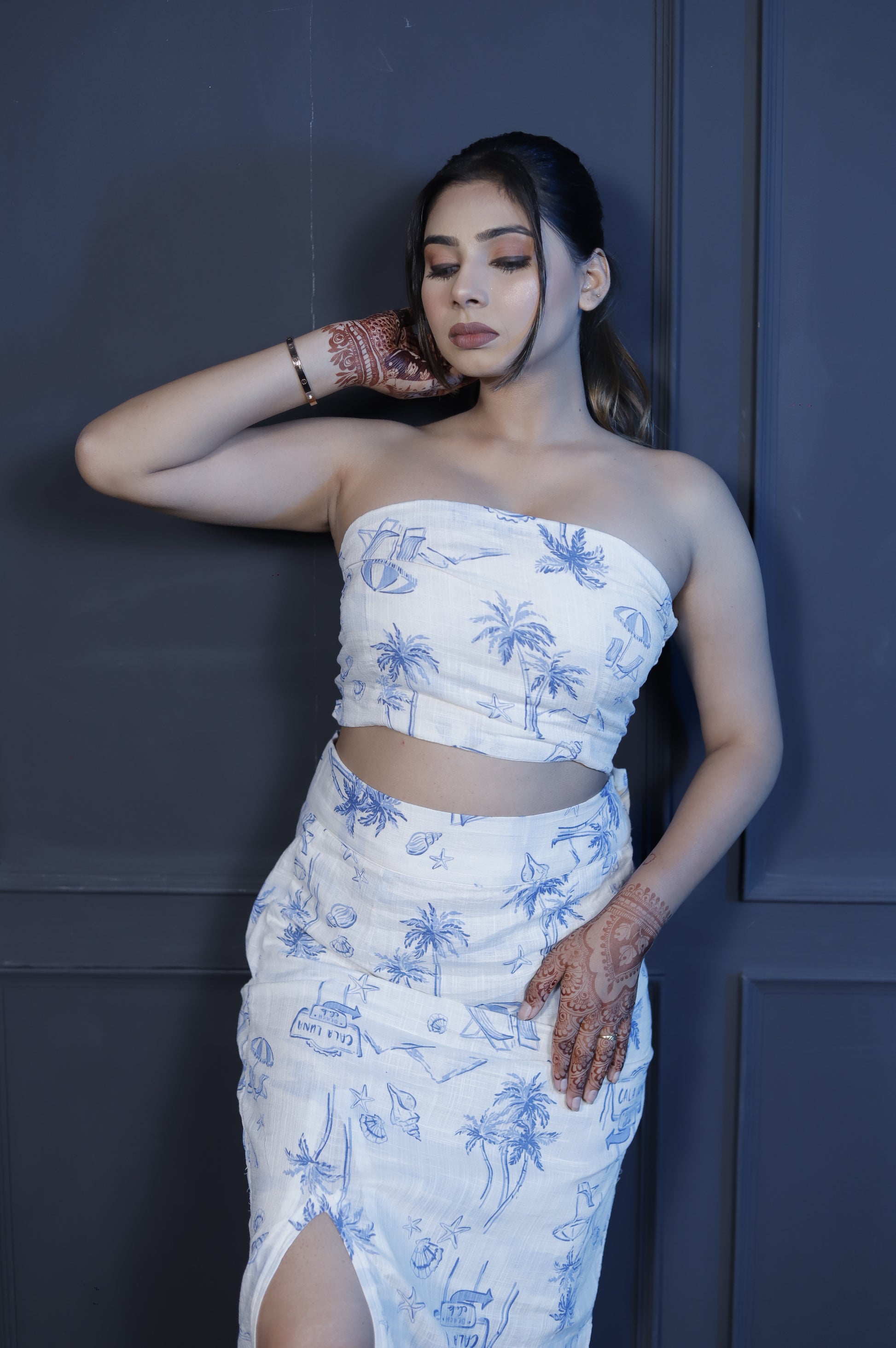 White & Blue Tropical Print Co-Ord Set – Bandeau Crop Top with High-Slit Skirt for Women