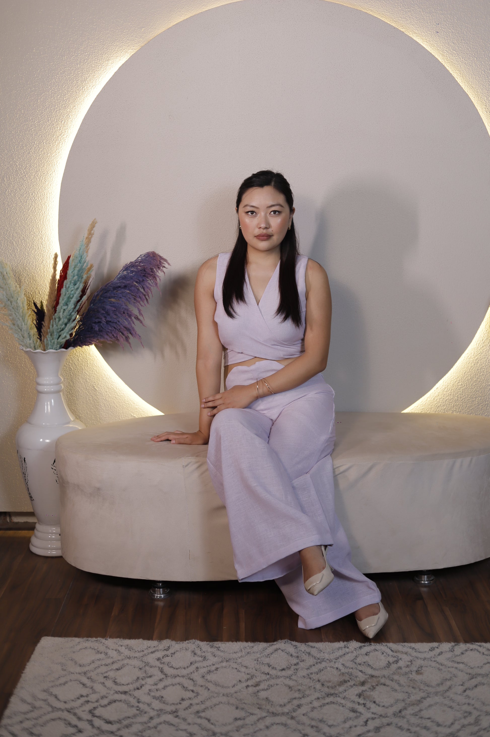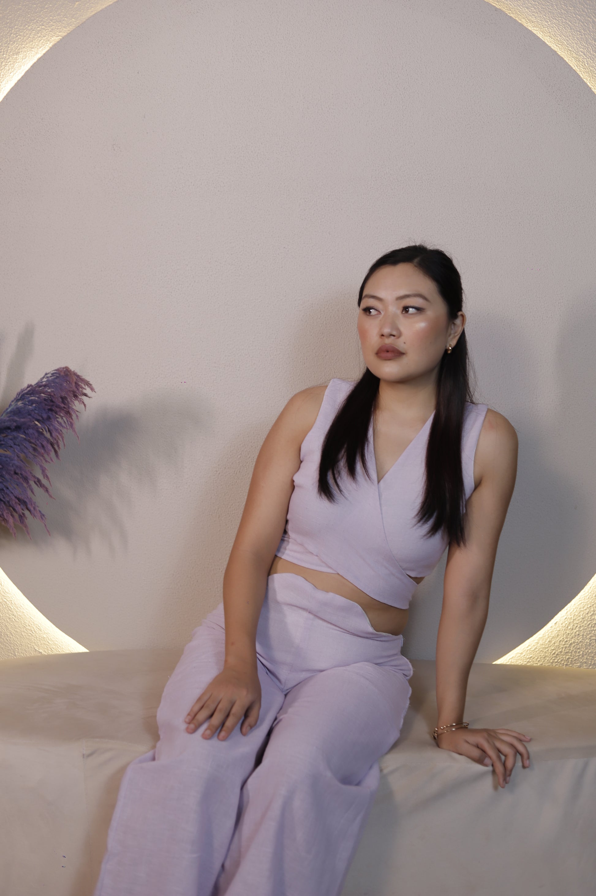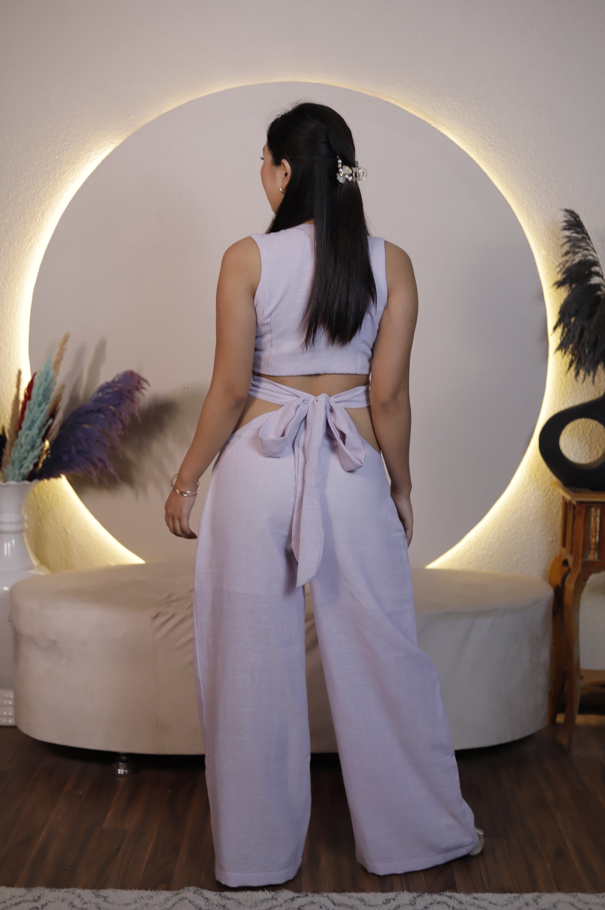 Step into effortless elegance with this lavender sleeveless wrap crop top and wide-leg pants co-ord set – a perfect blend of comfort and contemporary style. The sleeveless wrap design flatters the neckline and waist, while the high-waist wide-leg pants create a flowing, elongated silhouette. Designed for the modern woman, this co-ord is crafted in a soft, breathable fabric that ensures comfort even on the warmest days.
