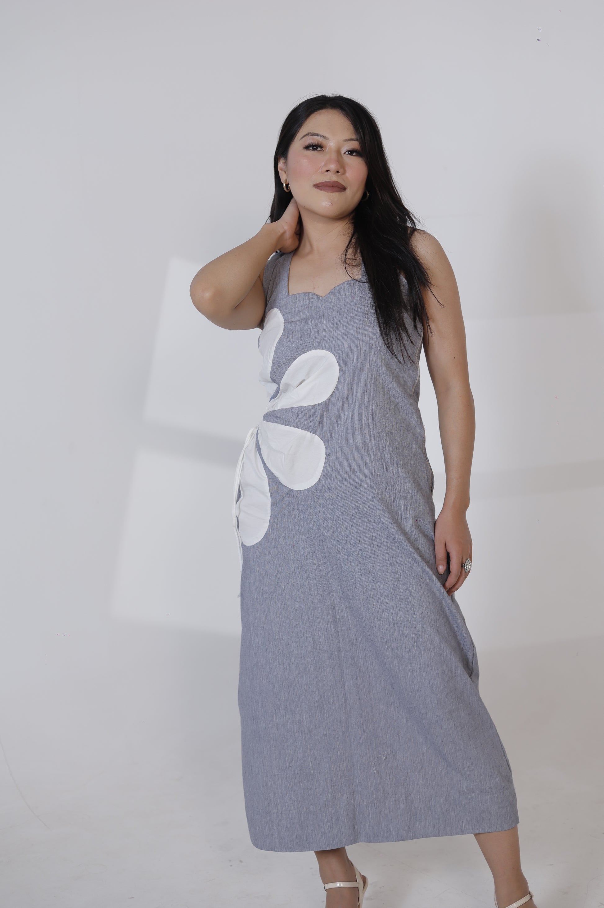 This elegant maxi dress features a soft chambray fabric in a soothing slate blue hue, enhanced by bold white floral appliqué detailing along the bodice and torso for a modern touch. The dress offers a chic sleeveless cut and a flattering straight silhouette, making it perfect for daytime outings and casual occasions. Pair it with strappy sandals for a breezy, effortless look.