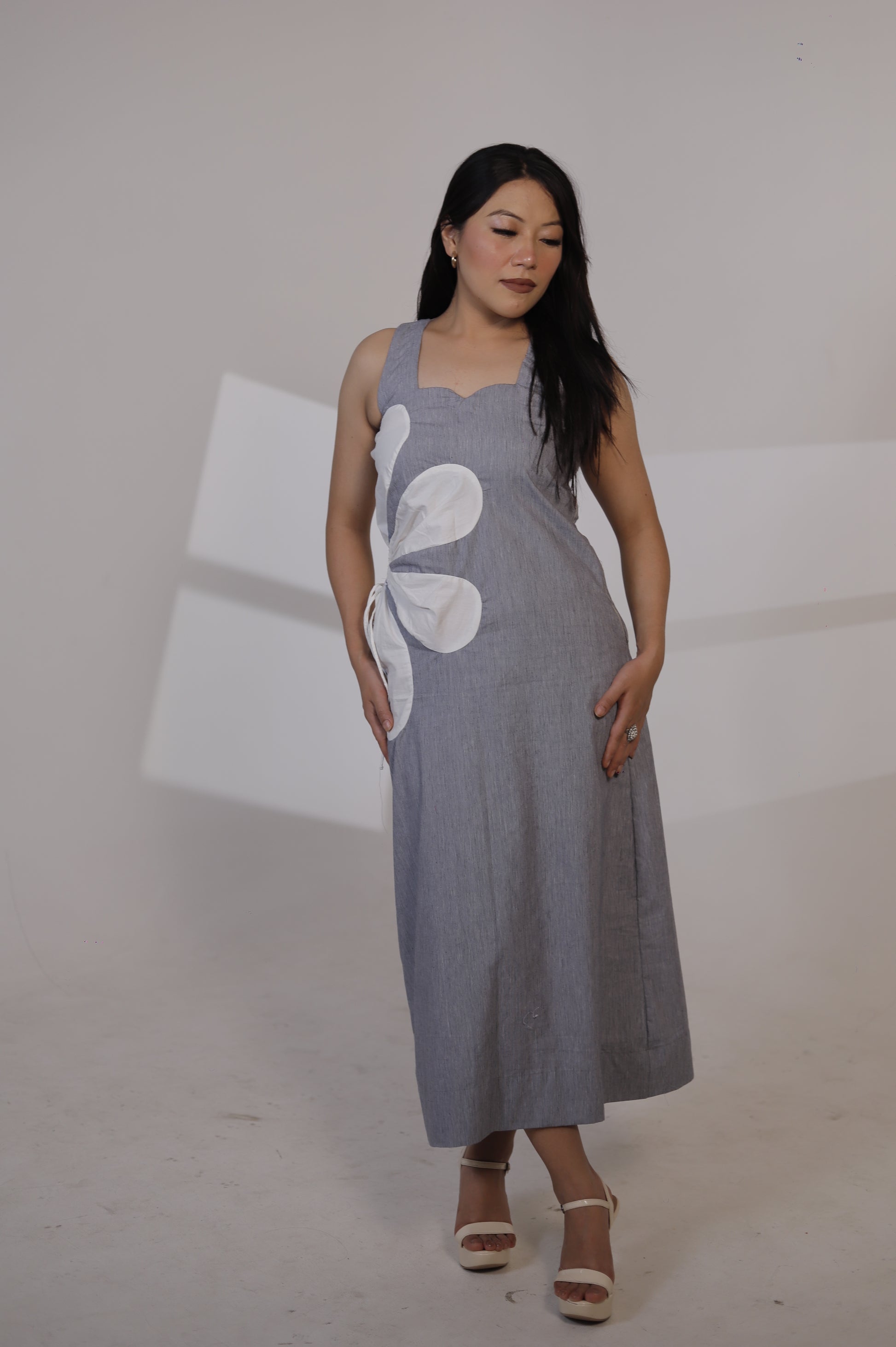 Sleeveless Chambray Maxi Dress with Floral Appliqué