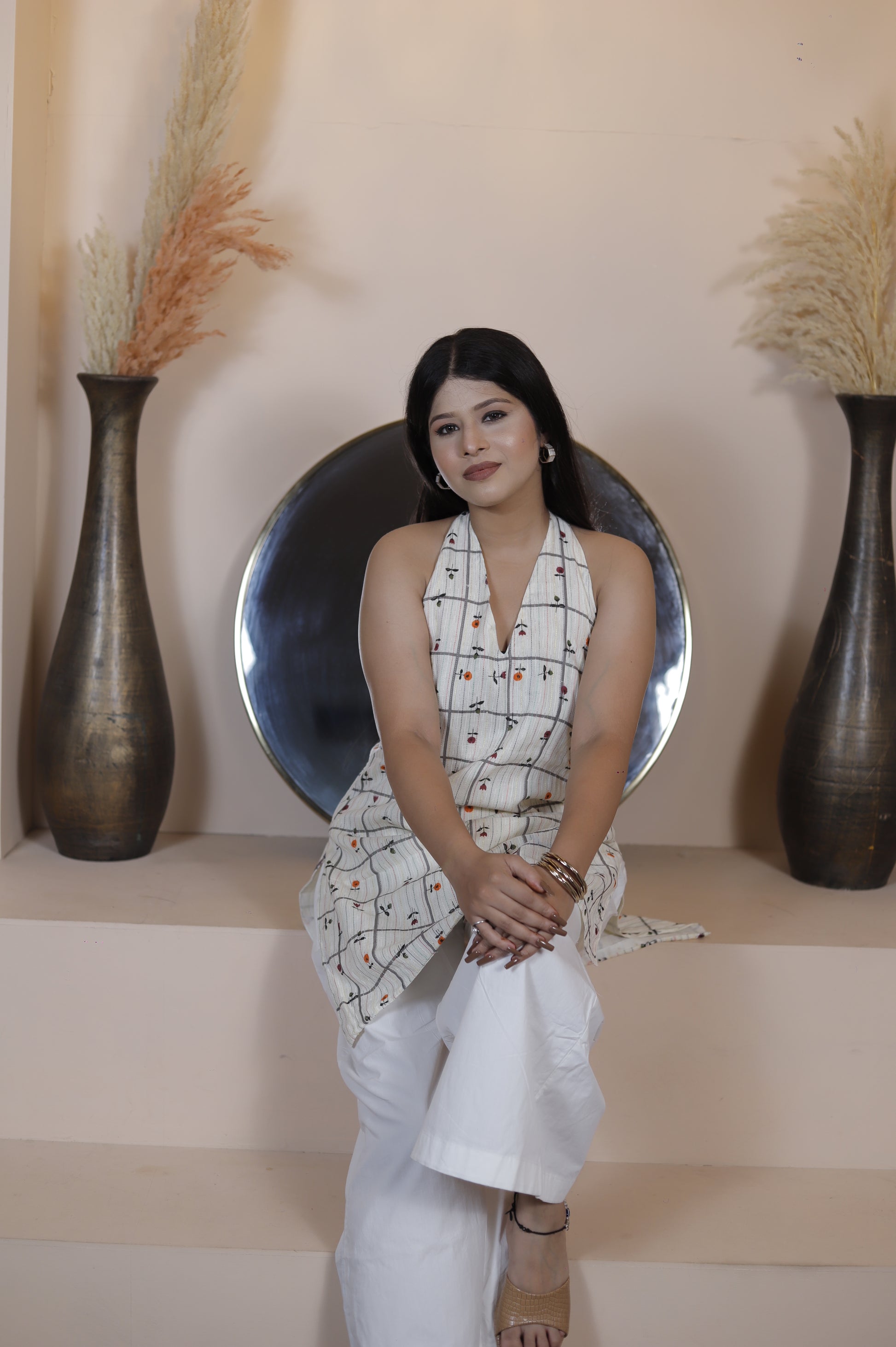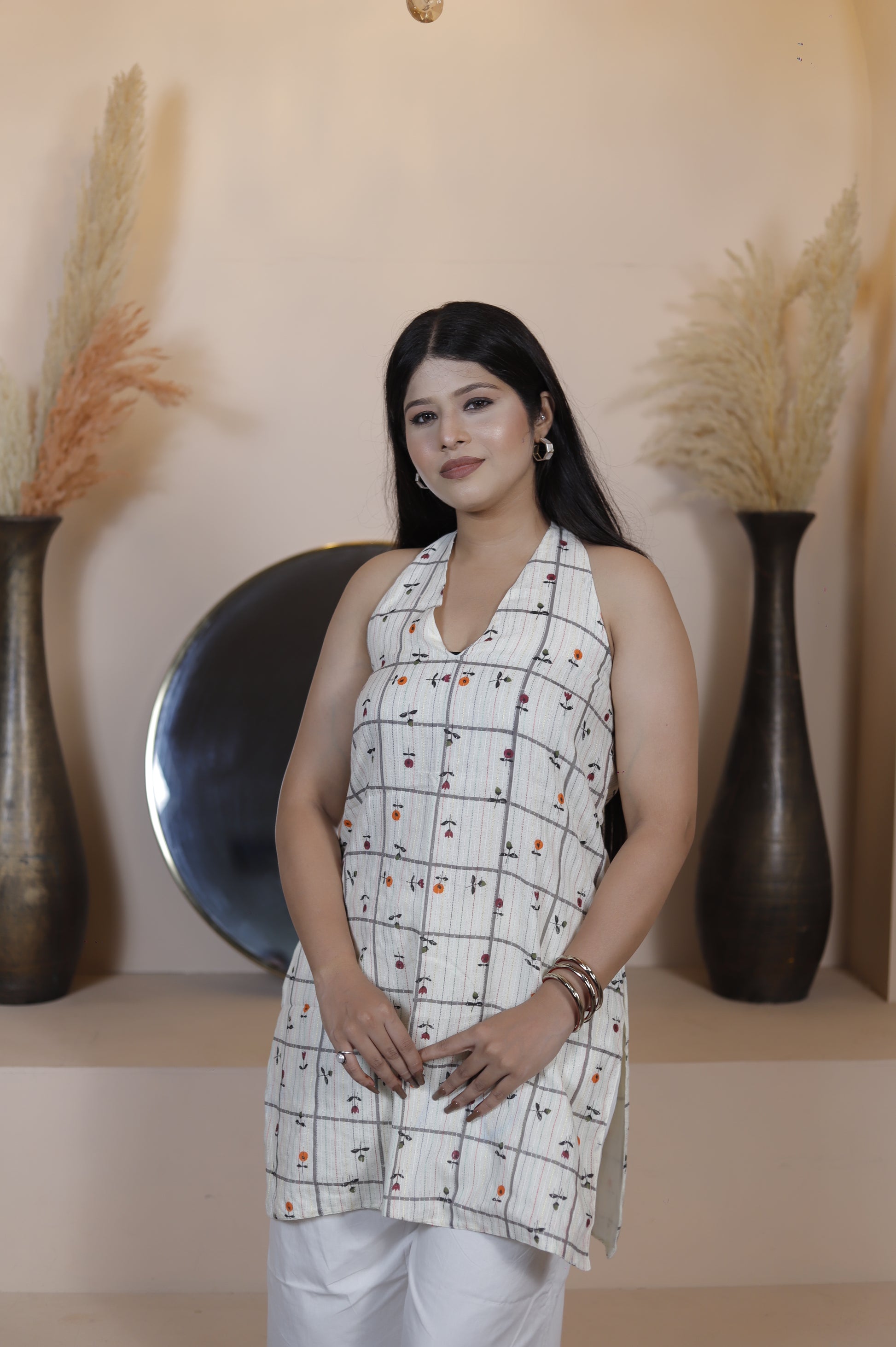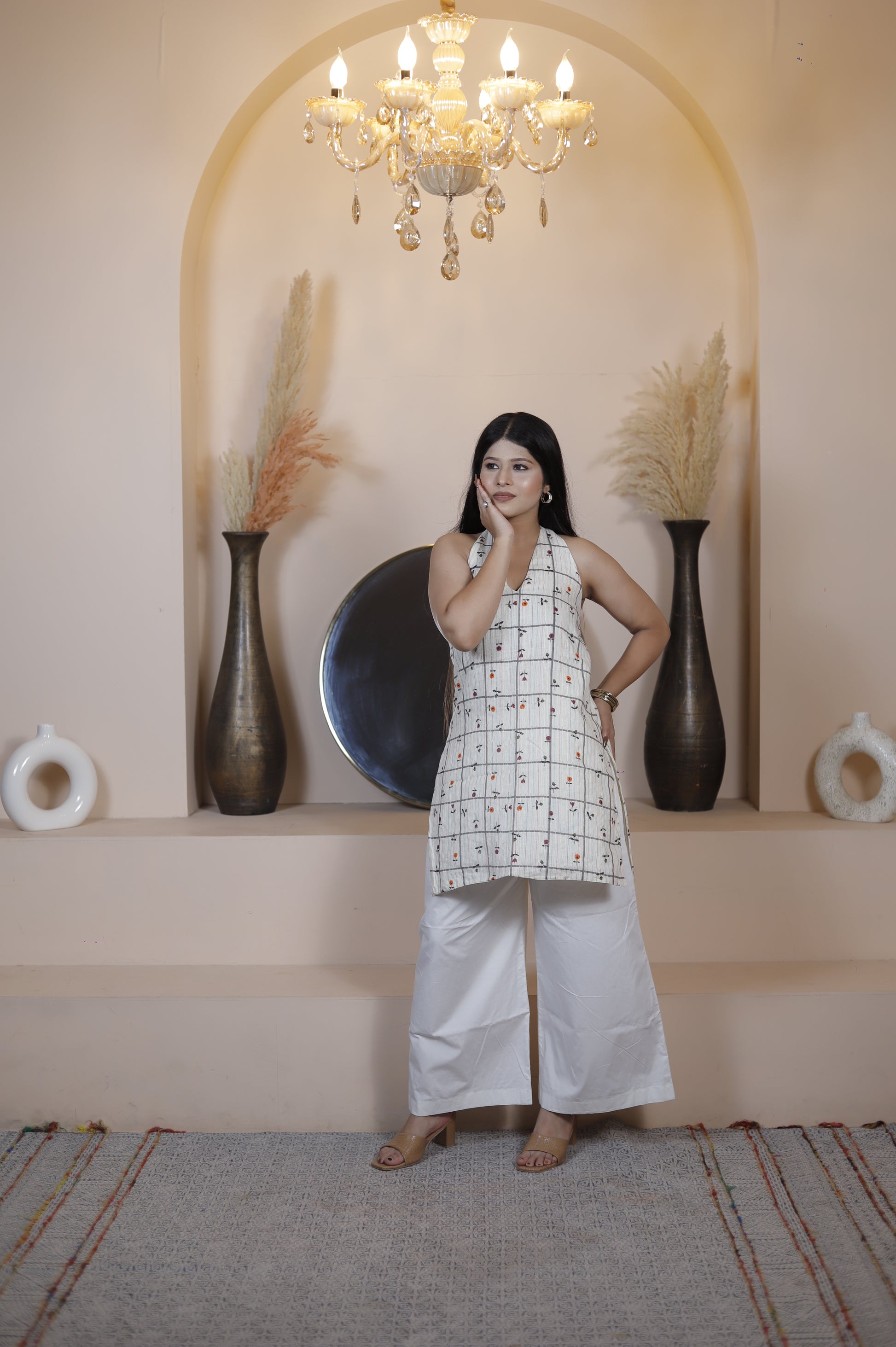 Elevate your ethnic wardrobe with our Beige Halter Neck Embroidered Kurta, paired with crisp white palazzo pants. The kurta features a modern halter neckline with intricate floral embroidery arranged in a grid pattern, giving it a perfect blend of traditional craft and contemporary style.