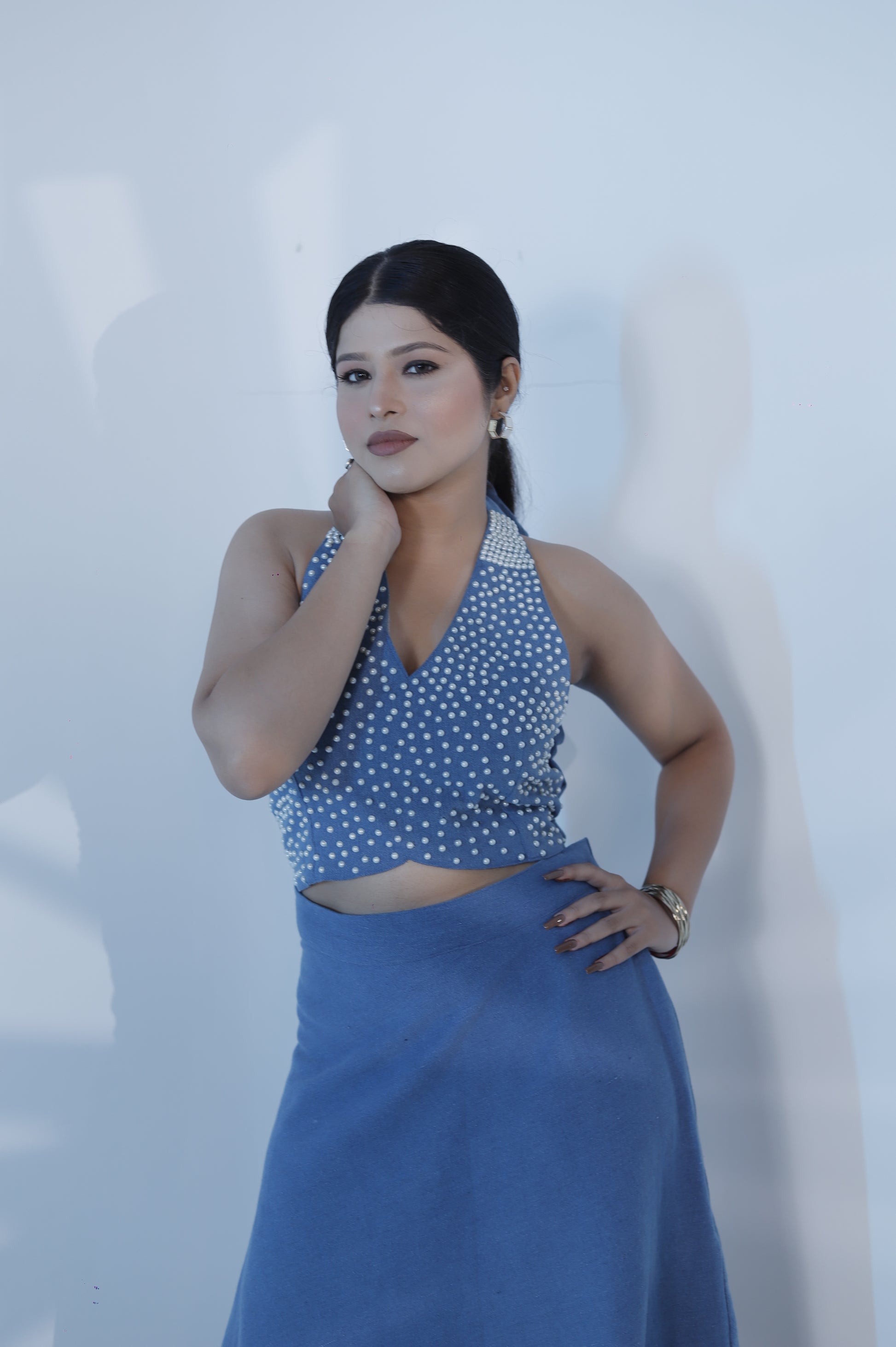 Beaded Pearl Denim Two-Piece Dress Set – Halter Crop Top & Slit Maxi Skirt