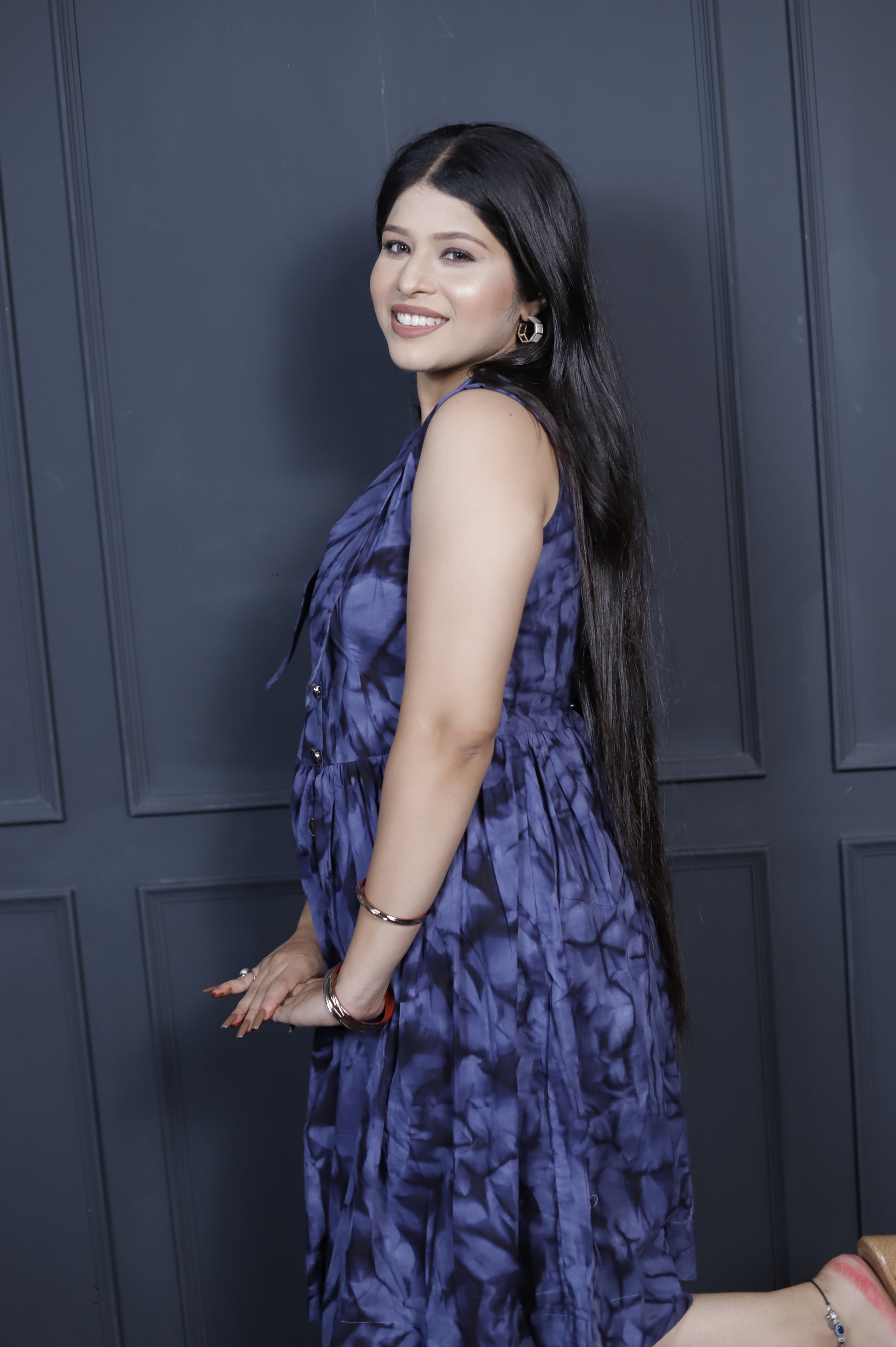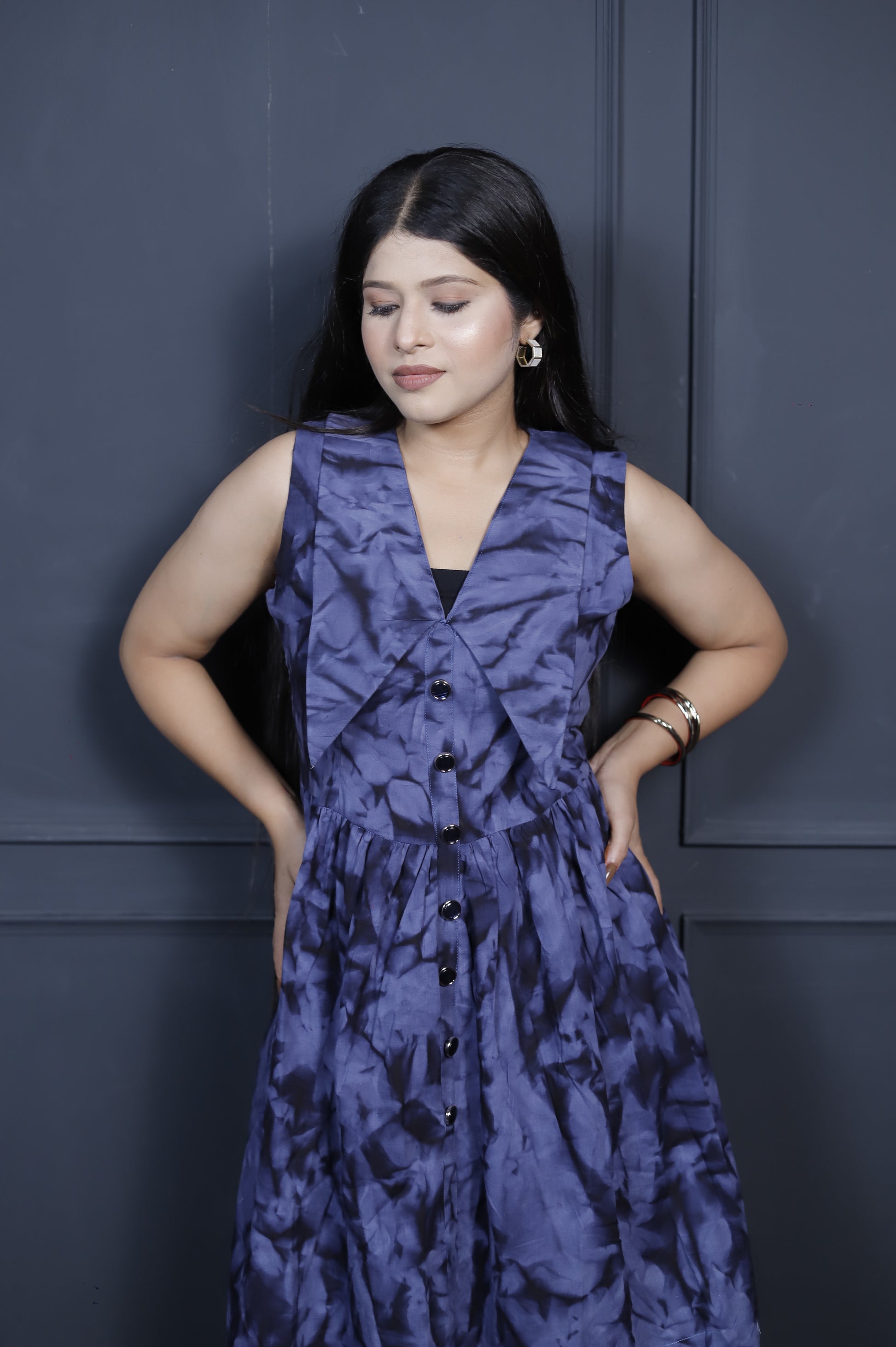 Navy Blue Sleeveless Tie-Dye Button-Front Dress – Casual Fit & Flare Knee-Length Dress for Women