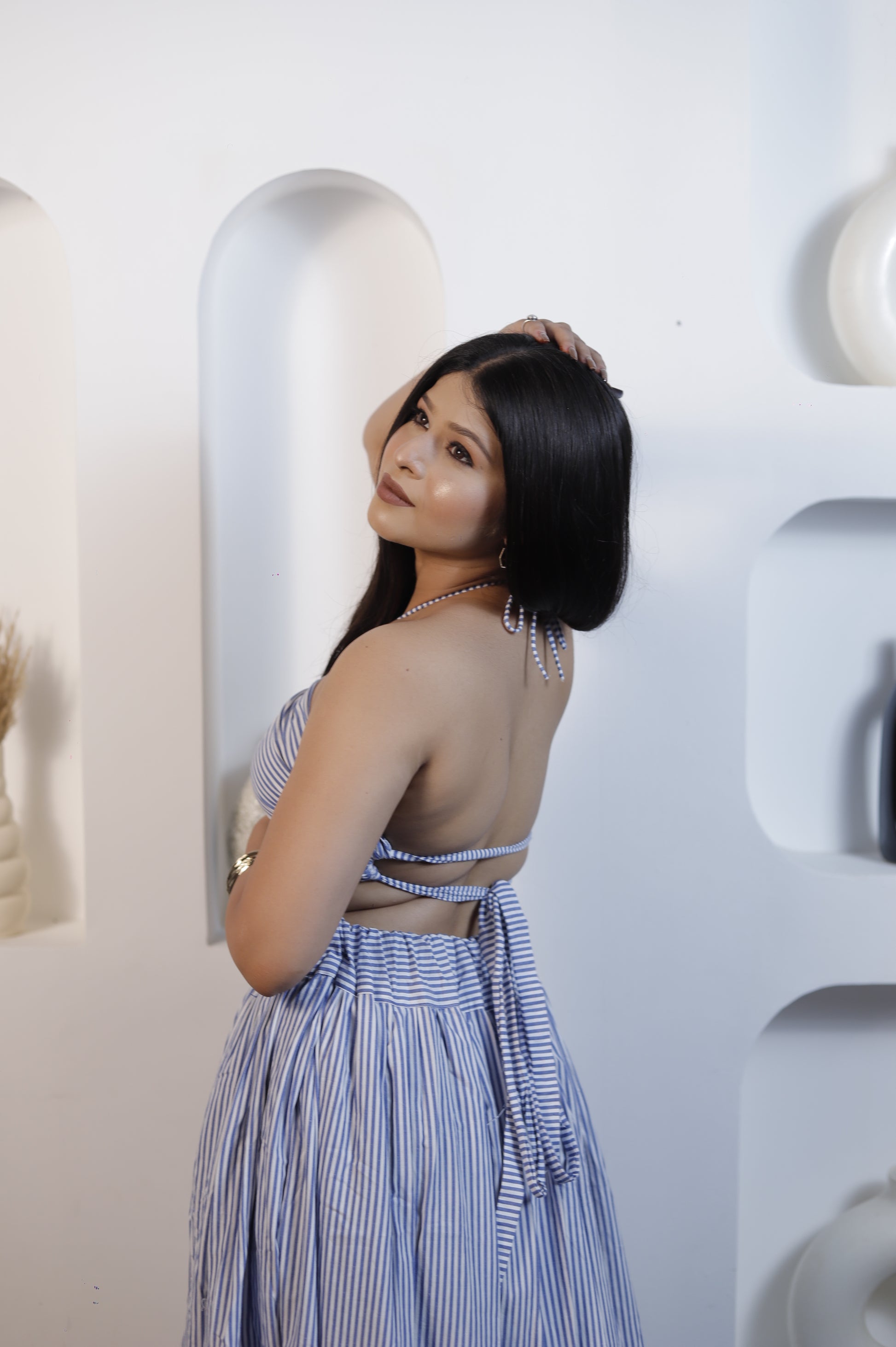Blue & White Striped Two-Piece Co-Ord Set – Halter Knot Crop Top with Flared Maxi Skirt for Women