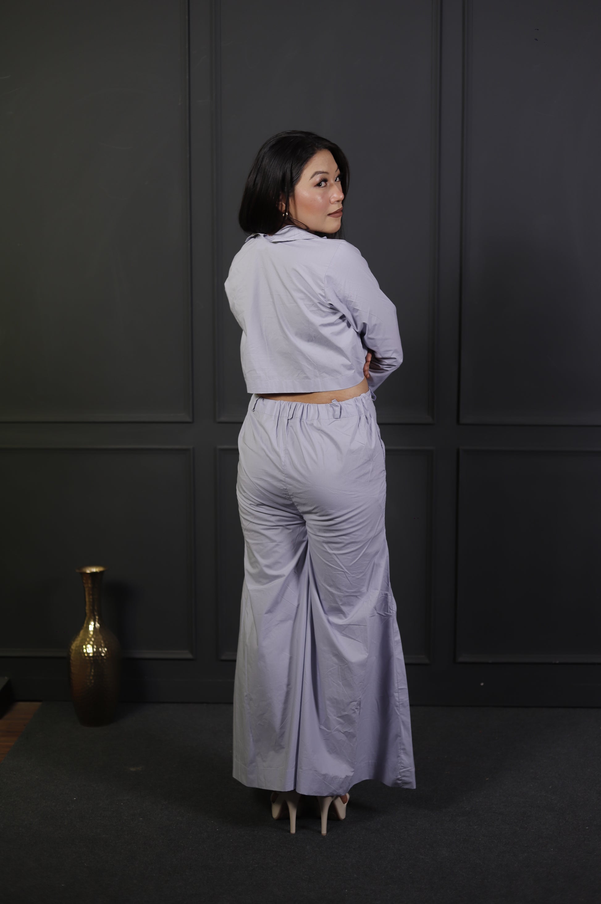 Lavender Buttoned Crop Jacket & Front-Slit Wide-Leg Pants Co-ord Set – Statement Women’s Wear